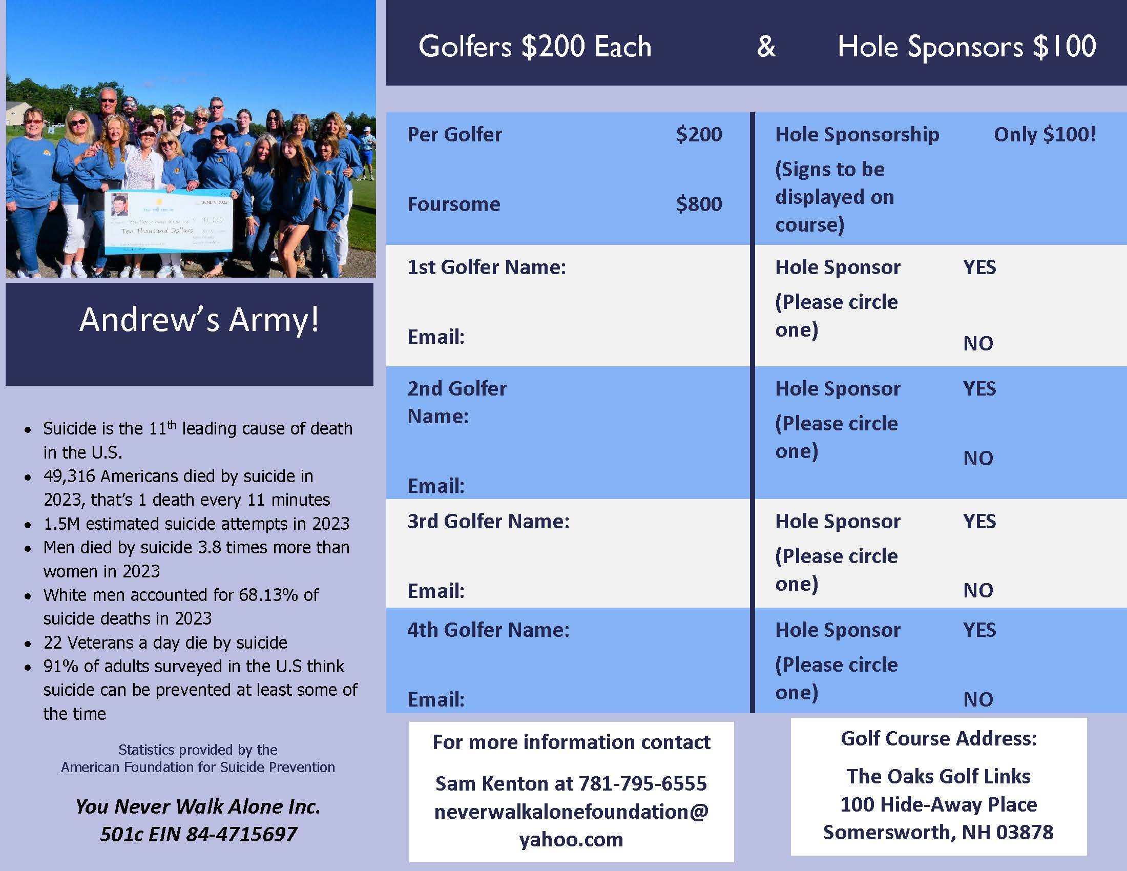 The 2026 Never Walk Alone Charity Golf Event returns June 26, 2026 at The Oaks Golf Course (NH). Registration opens in early February — and it always sells out!